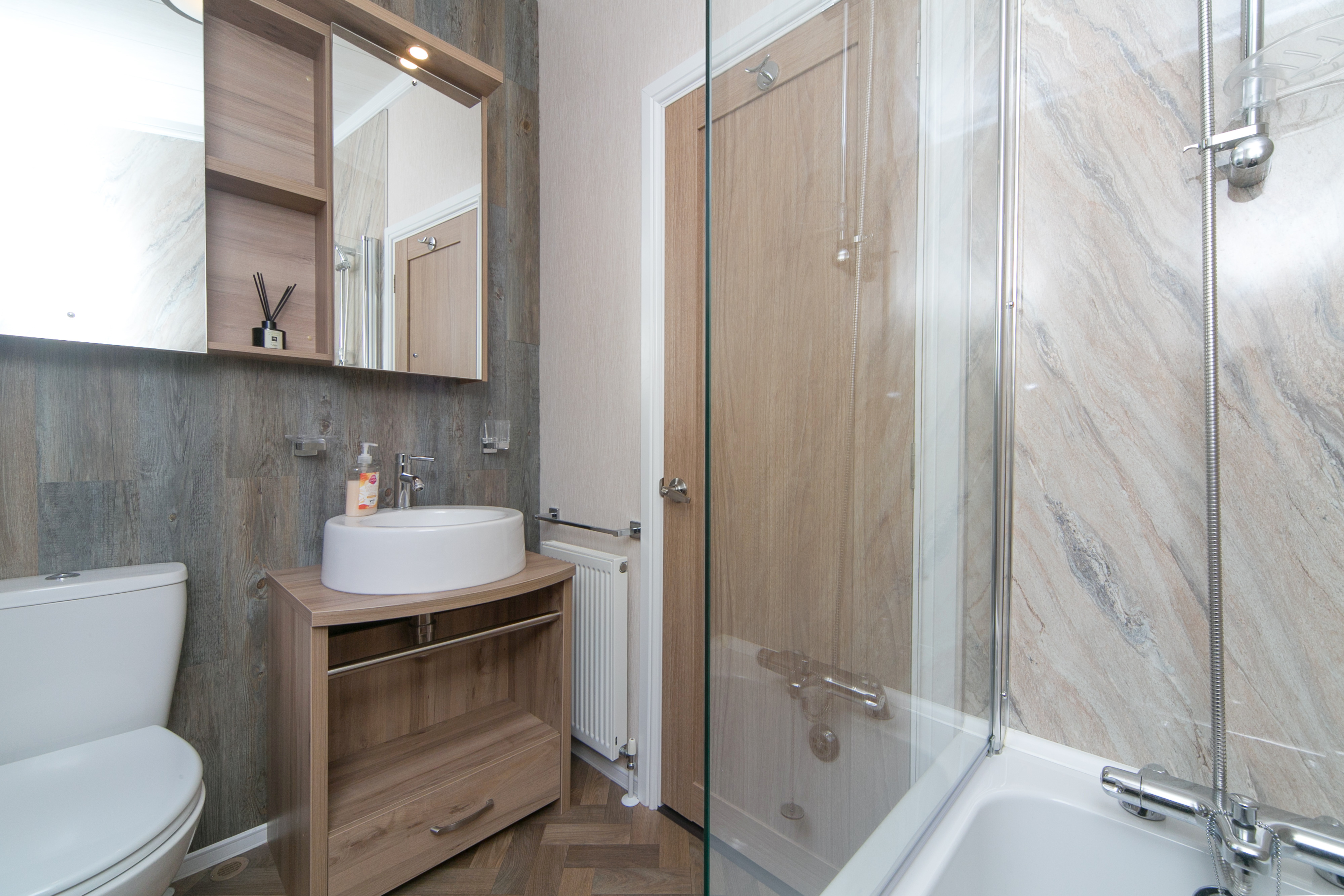 With a family bathroom as well, there's plenty of space for everyone to get ready without the morning queue! The main bathroom comes with a fitted full-length bath plus shower attachment, stand-alone vanity unit, washbasin and W.C. The luxury finish is present in the decor through-out the lodge, and the bathroom is no exception. One of the most useful areas and something only seen in the 44 ft Pemberton Rivendale model is the addition of a utility room, complete with sink, washer-dryer and ample storage space. The perfect port of call after those muddy days out with the kids or your four-legged friends before entering the living quarters to the lodge.