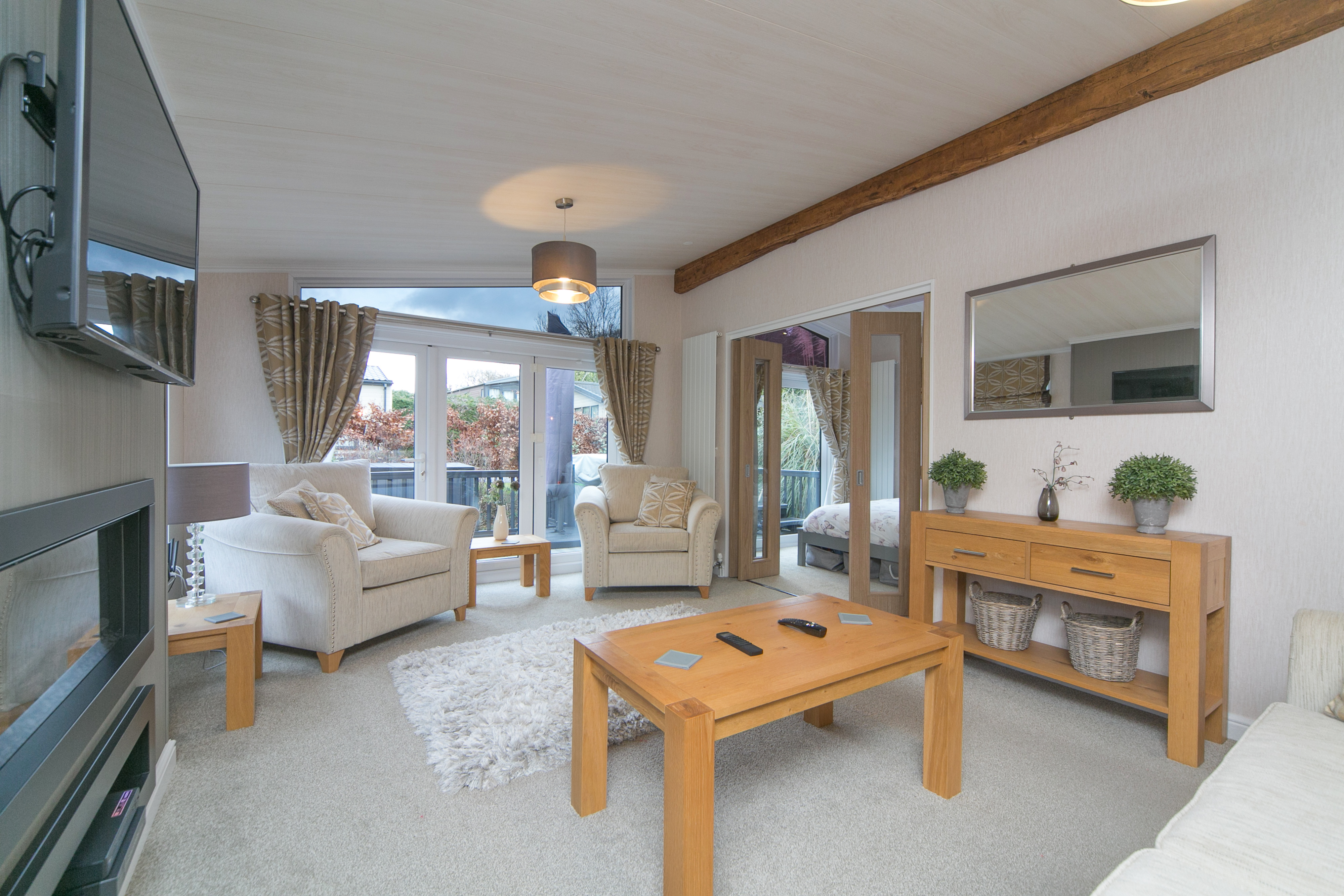 Walk into a bright, welcoming open-plan country style kitchen and living area that's perfect for modern holiday living. The kitchen comes fully equipped with integrated appliances - oven, hob, microwave, American style fridge freezer and a large wine cooler - so you can start enjoying your breaks from day one. What really makes this space special are the double sliding doors that open straight onto the expansive decking area. On sunny days, you can throw them open and let the outside in, creating one big entertaining space. Add into this the addition of Bluetooth speakers throughout the living space this home is perfect for anyone looking to entertain friends and family.