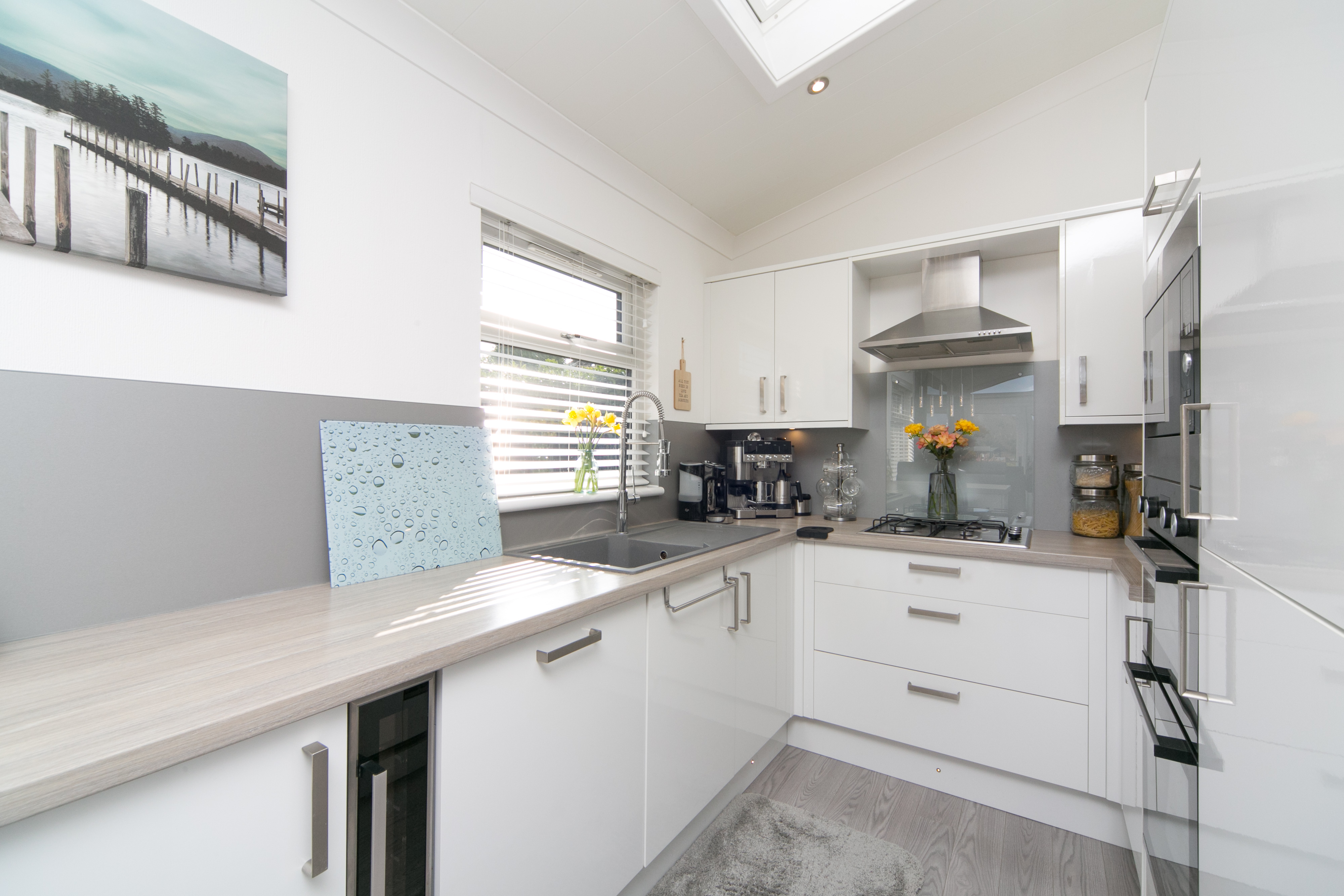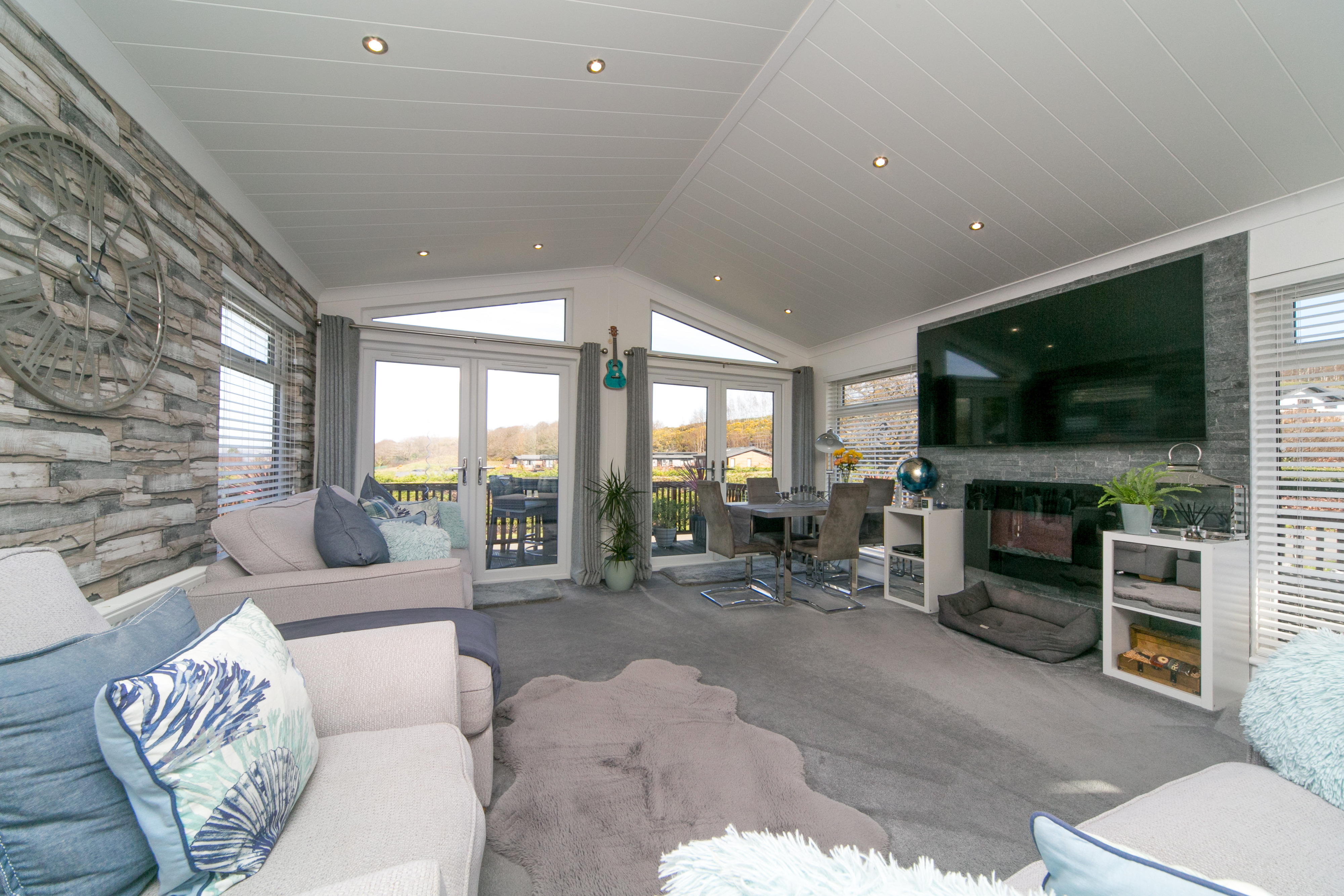 The Vancouver Lodge is well equipped with its open plan kitchen, dining and living room space complete with all brand new uprated appliances including dishwasher and spacious dining area positioned alongside the large bay window that allows for lots of natural light to enter the lodge, making it the perfect place for a family get together. The lounge and dining furniture is all high quality and free standing allowing for personal touches to be added to the lodge. When you walk through the front door of the Vancouver lodge you are instantly drawn to the sheer amount of natural light that enters through the front opening doors and large surrounding windows. The living area uses the space fantastically to allow for a cosy feel with wall mounted television and stylish electric fireplace.